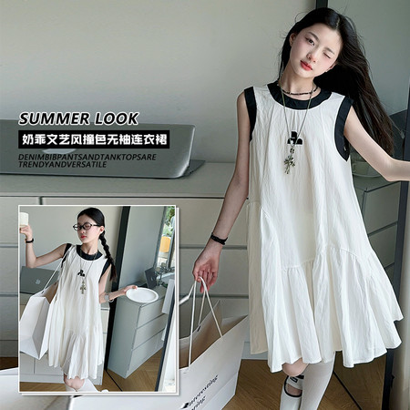 1*6下载视频“XZ2025-42白色撞色黑袖边连衣裙”